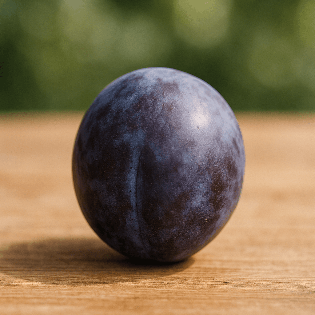 Grosse prune ovoïde bleu foncé 40 g, chair jaune verdâtre sucrée, noyau libre, très polyvalente.