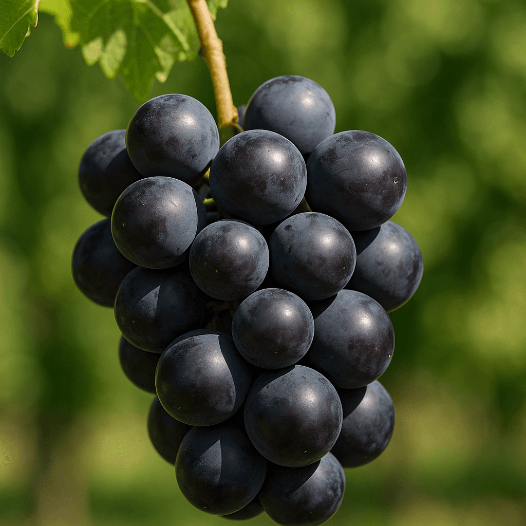 Très gros grains sphériques noir bleu, peau épaisse, chair ferme juteuse douce, cépage français tardif à forte vigueur.